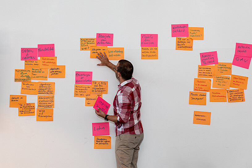 Die Arbeitsgruppe des Projekts «Teilzeitbau» diskutiert Arbeitsmodelle für eine bessere Vereinbarkeit von Beruf und Privatleben im Gebäudehüllengewerbe.